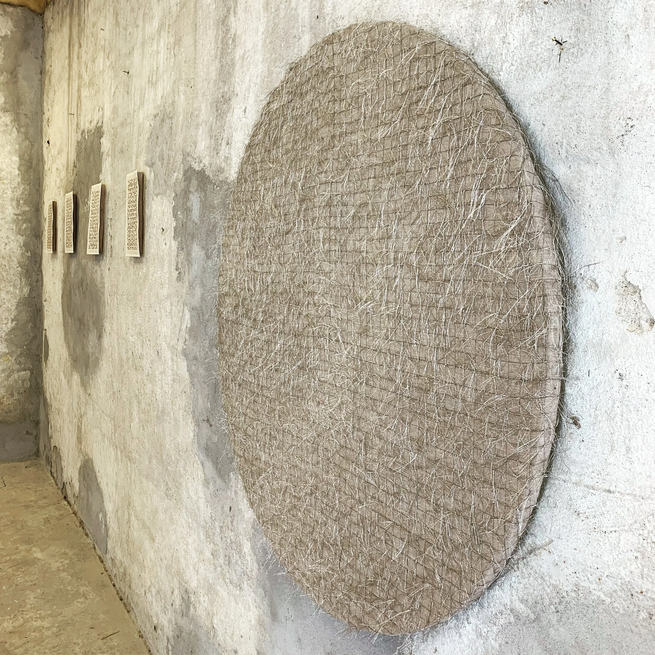 The second element is circular, linen-covered, and marked by a drawn grid. Silver-thread knots are placed at fixed points along a simple cross structure. The knots function as points of binding and suspension rather than closure, holding the surface in a state of restrained tension.
